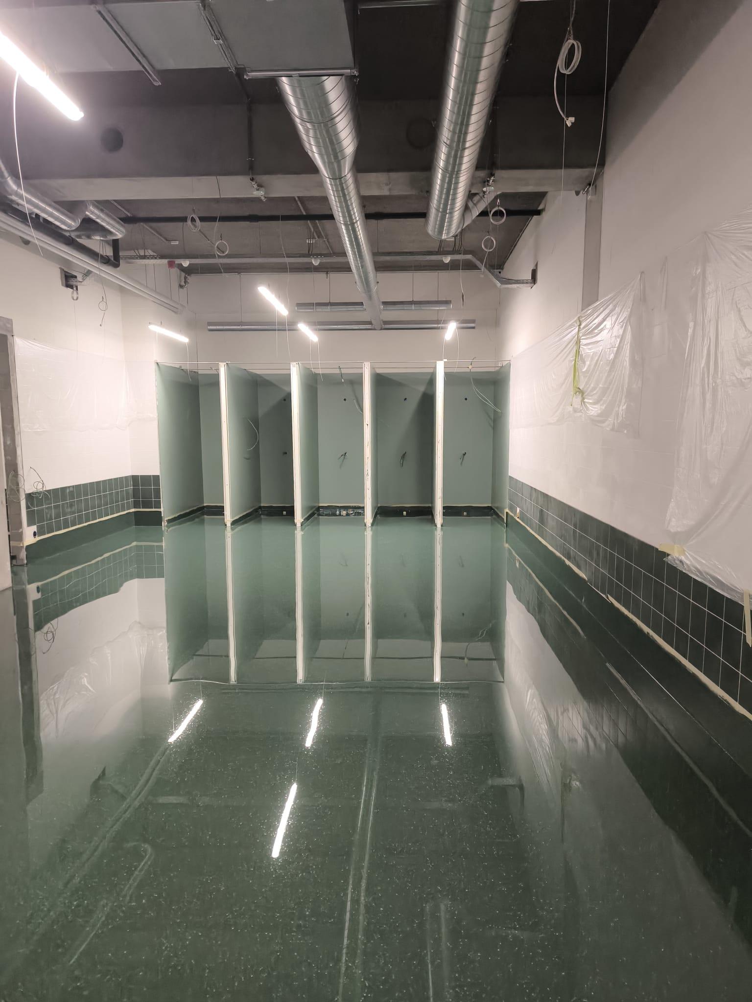 Daarnaast werden de doucheruimtes uitgerust met dibondplaten, die we zorgvuldig hebben afgewerkt met een slijtvaste PU coating. Dit zorgt voor een strak, hygiënisch en waterdicht geheel.