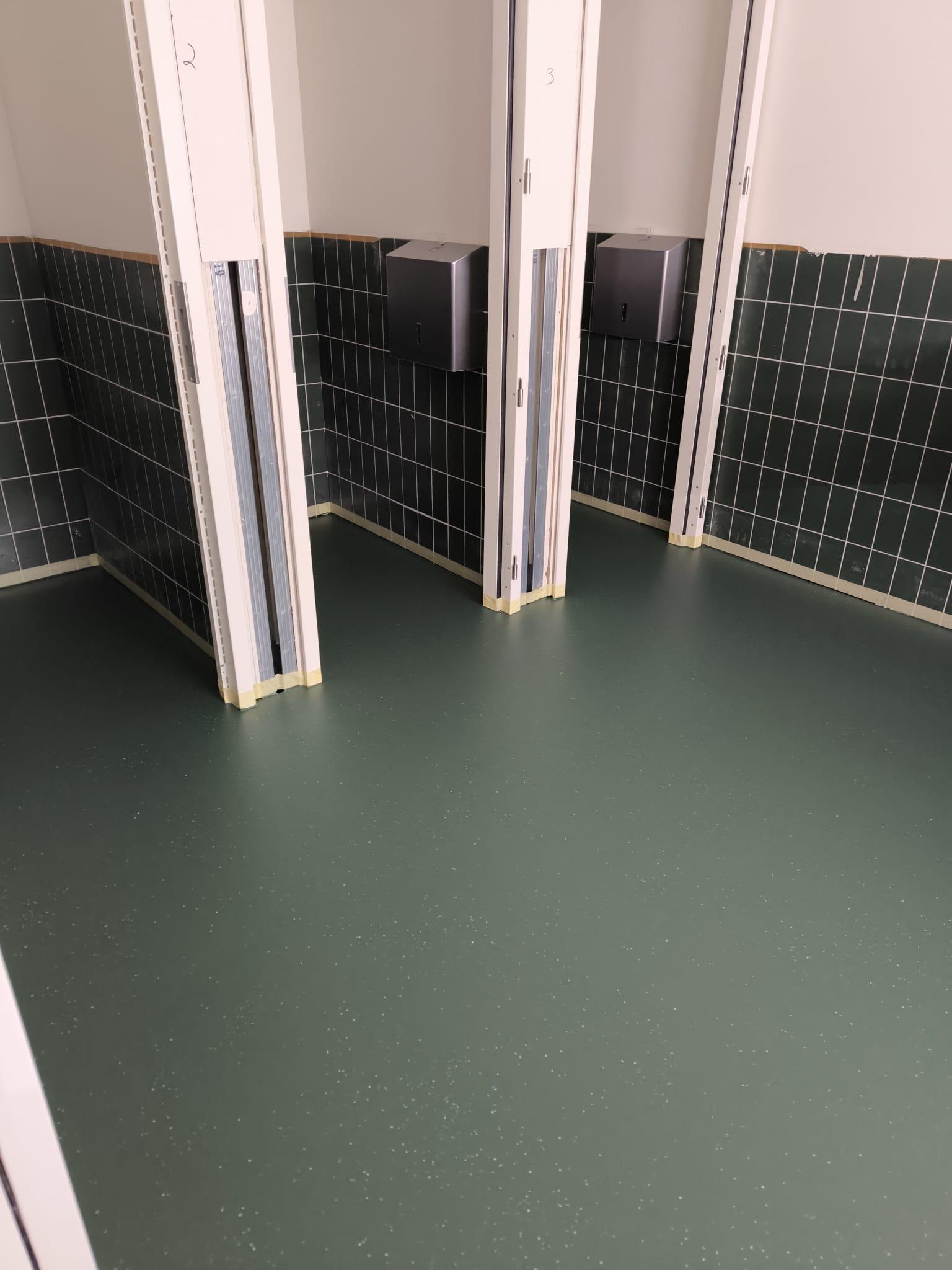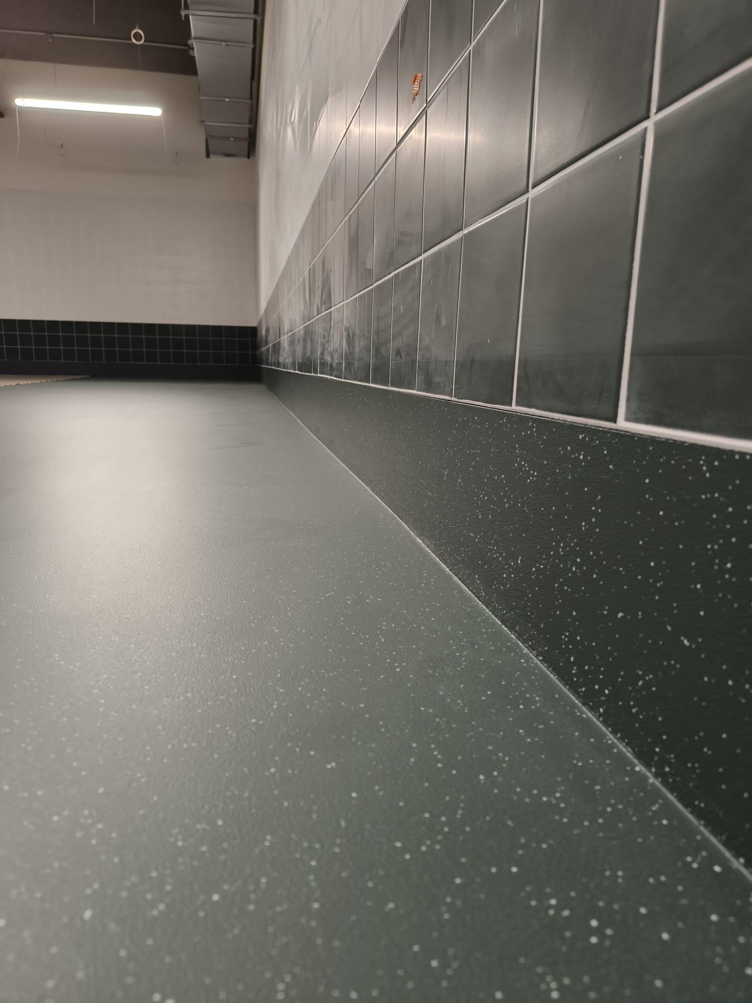 In de kantoorruimte, de kleedkamers en de sanitaire ruimtes van een voedingsverwerkend bedrijf werd een hoogwaardige PU gietvloer geplaatst. Om een duidelijke afscheiding per zone te creëren, werd gekozen voor dezelfde vloerafwerking met een verschillende kleur per ruimte.